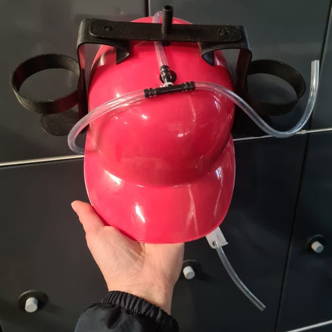 Gøyal drikkehjelm med slanger og plass til 2 bokser drikke.