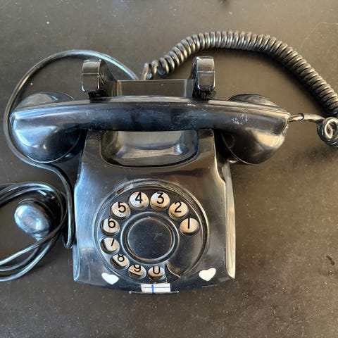 Flott og sjelden bordtelefon fra Elektrisk Bureau (EB), trolig fra 1930- eller 40-tallet. Et ikonisk design i sort bakelitt med dreieskive – perfekt som dekorasjon eller til en samling.