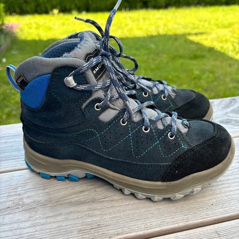 Fantastisk gode fjellsko / tursko fra sveitsiske Lomer. Lær inni og utvendig. Perfekt til værmere omgivelser (vi har brukt dem i Alpene om sommeren), fordi de ikke har Goretex, så føttene svetter ikke. Skoene tåler likevel regn og vann når man vokser de av og til. Veldig god Vibram såle. Skoene ble brukt av to barn i noen få dager. Innersålen er 19.5 cm lang.