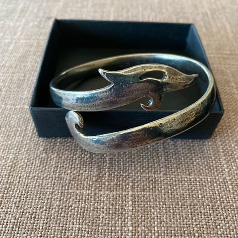 Kombinert anheng og nål i bronse fra UNI David-Andersen selges. Design av Unn Tangerud. Stort og flott smykke. Høyden med dingelidang er ca. 8,5 cm. Diameter på den store delen er ca. 5,7 cm.