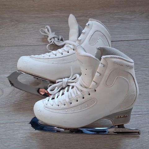 Skøytene er i god stand. Brukt en sesong av en løper og kun prøvd et par ganger av første eier. En del bruksmerker foran på høyre skøyte, men ellers fine. Uten jern.