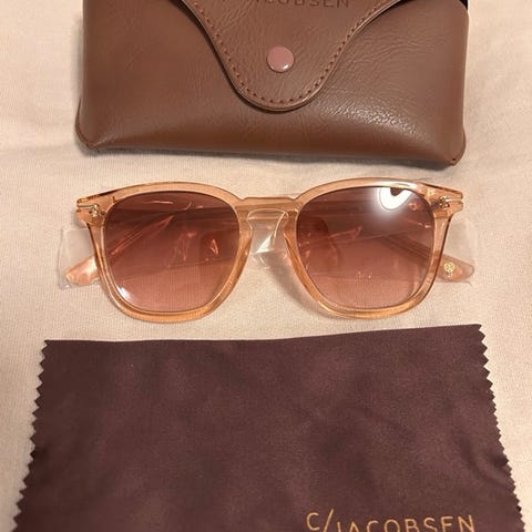 Selger D. Arnesen solbriller med speilet glass og transparent innfatning.