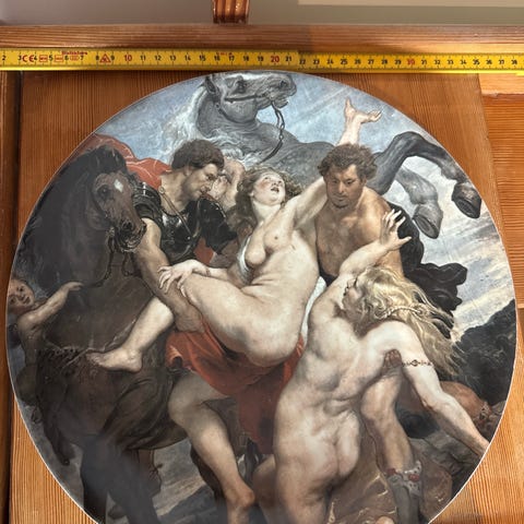 Selger to vakre, dekorative veggfat med relieffmotiv fra gresk mytologi – håndlaget i Hellas (Athen), på 1960-tallet.