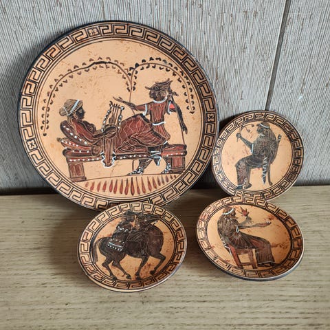 Fatene er laget i keramisk materiale med malte detaljer og klassisk gresk border rundt kanten.