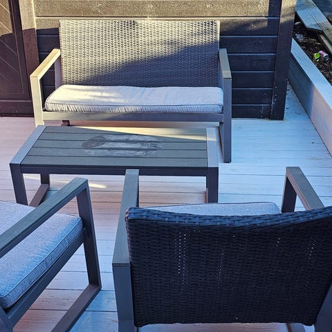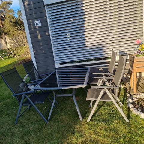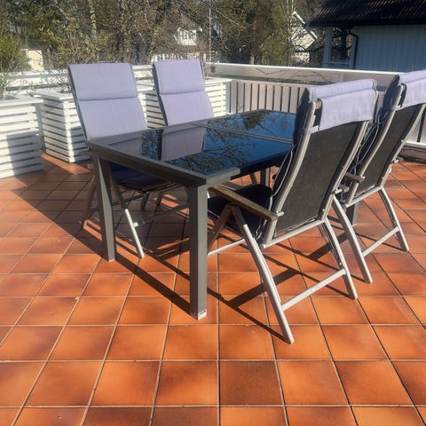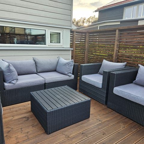 Utemøbler i meget god kvalitets sittegruppe 2 stoler, delvis glassbord og en 2-seter. Grå puter følger med . Pent og lite brukt og har stått inne på varmt lager 8 måneder i året. Stått ute på sommeren fra 15. mai til 15. september. Sterk og solid rotting. Møblene må hentes. Kan være behjelpelig med bæring, og levering i nærheten for et tillegg etter avtale..