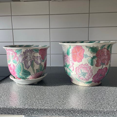 To fine, håndmalte blomsterpotter i keramikk i pen stand, med mindre bruksspor. Diameter ca 17 cm, høyde ca 12 cm. Pris kr. 75,-. pr. stk. Selges kun samlet til kr. 150,-.