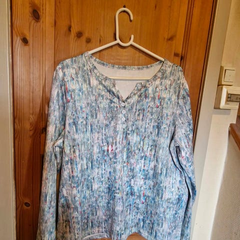 Lang gulgrønn topp med høy splitt. Str. 44. Smal fasong med 3/4 ermer og grå-hvite striper med dekor i front. Lengde:108 cm. Bredde målt tvers over: 48cm. Toppen kan sendes. Kr.150