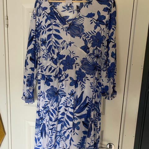Sommerkjole i hvitt og blått fra Ane Mone i str 42. Pent snitt og strikk bak for å fremheve livet. Kjolen fremstår som ny. Se detaljbilder for mål. (Nypris kr 999,-)