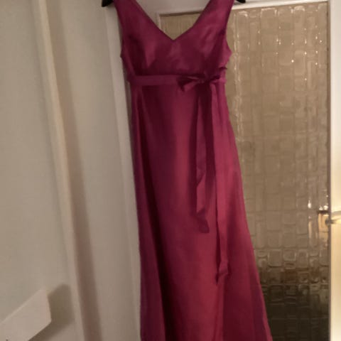 Lang kjole med nydelige perle- og blondedetaljer på overdelen. Sitter pent i livet og faller mykt og fint. Brukt én gang – som ny! Størrelse L, men passer best M (smal i fasongen) og glidelås i ryggen - dermed har jeg skrevet M i annonsen.