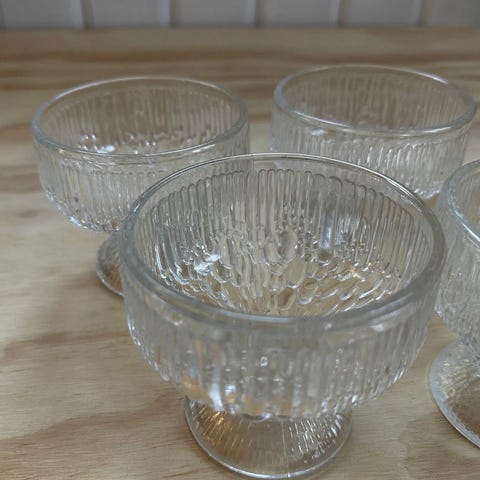 Selger fire pene eldre Iittala Miranda skåler. Design: Heikki Orvola. Produsert mellom 1970-75.