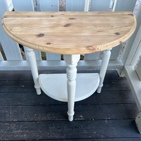 Lite bord med "aviskurv" under selges for 75 kr. Ikke særlig pent, så noen strøk maling trengs.