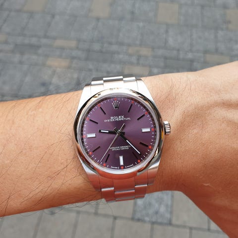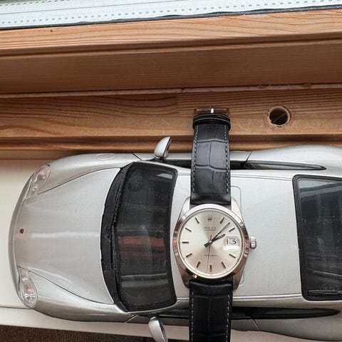 Klokken står nå på en ettermarked oysterlenke, men kan også fås på en en grå rem i semsket skinn.