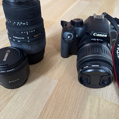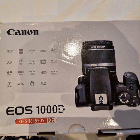 Selger mitt Canon EOS 1100D, komplett med original lader og solid kamerabag. Kameraet har et 12 MP APS‑C sensor, tar HD-video (720p) og fungerer helt problemfritt. Ideelt for nybegynnere eller som andrekamera.
