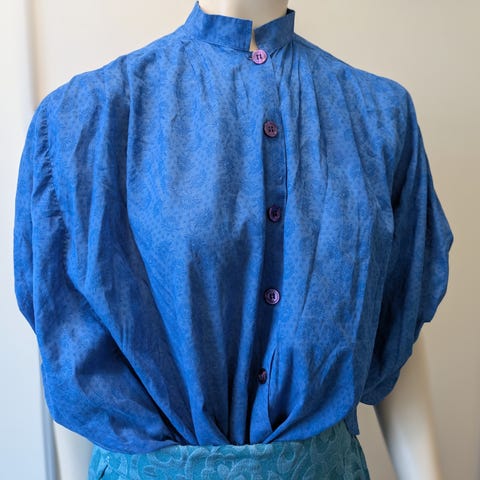 sjøgrønn/brun kant rundt halsen, spesielle ermer som er kortere bak for med bevegelighet