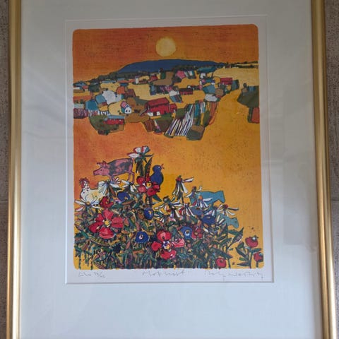 Dekorativt og fargerikt kunsttrykk med motiv signert Sven Erixon, 1937.