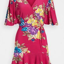 Kjempesøt wrap kjole fra Vero Moda. Volanger og feminint snitt. Rød med rosa blomster. Ikke foret. Supersøt kjole!