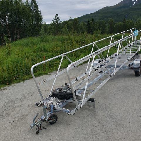 Landgang i aluminium 8 meter lang 1.4 meter innvendig bredde. Høyde på rekkverk er 90 cm. 25 mm. dredekke av impregnert furu. Nylon hjul med syrefast aksling.