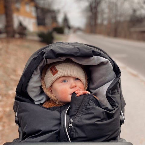 Beskyttet av en egen lomme er det lagt inn en snor rundt åpningen ved barnets hode slik at den enkelt kan snevres inn for å skjerme barnet for vær og vind.