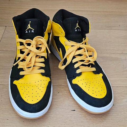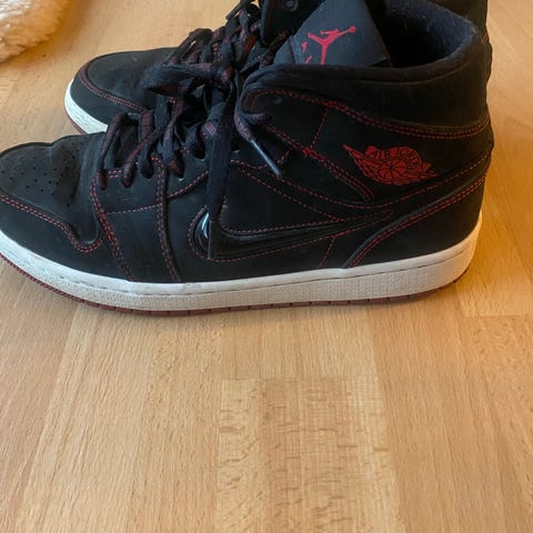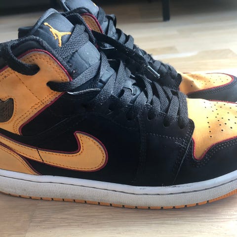 Selger et par brukte Air Jordans i svart og oransje. Størrelse er 42,5, men fikk ikke valgt halvstørrelser.