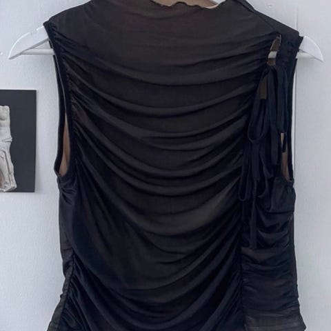 Toppen er pent brukt. Str. XS. Brystmål fra armhule til armhule er 39 cm, og hel lengde fra skuler og ned er 42 cm. 93% polyester og 7% spandex.