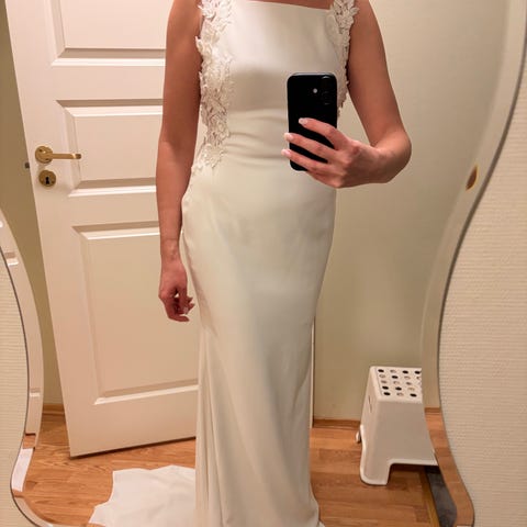 Klassisk håndlaget brudekjole i havfrue form med perler. Følger også med «armer» rett under skuldrene. Størrelse S/M.