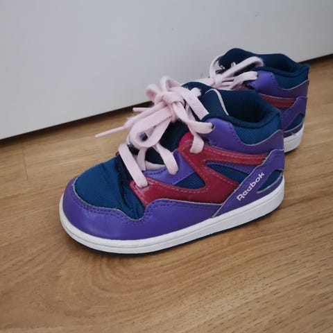 Selger disse kule joggeskoene fra Reebok i størrelse 21. Skoene er laget i mykt og slitesterkt materiale med strukturert overflate, og har praktisk borrelås som gjør dem enkle å ta av og på. Pent brukt og i god stand.