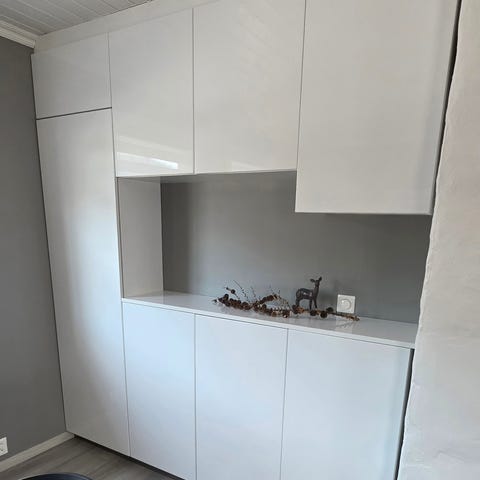 Tidløs hylleseksjon fra Kvik. Skap med glassdører. Kan brukes både på kjøkken eller i stue som på bilder vedlagt.