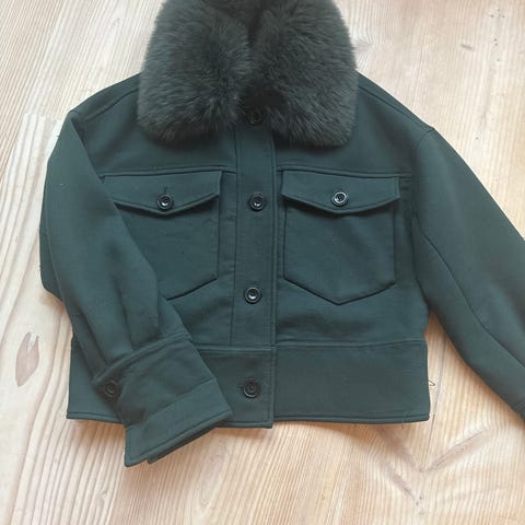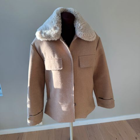 Selger en ny og ubrukt ulljakke med faux fur/fuskepels for min mor.
