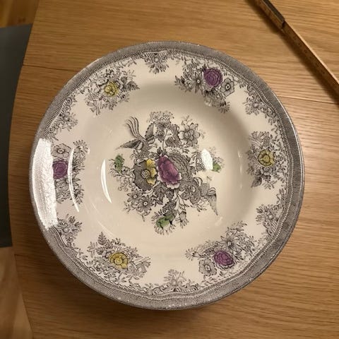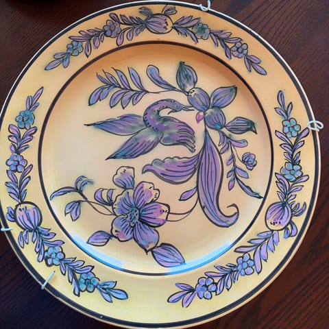 4 fat/skåler, det store fatet er 36 cm. Fatet med "ører" har liten kantskade.