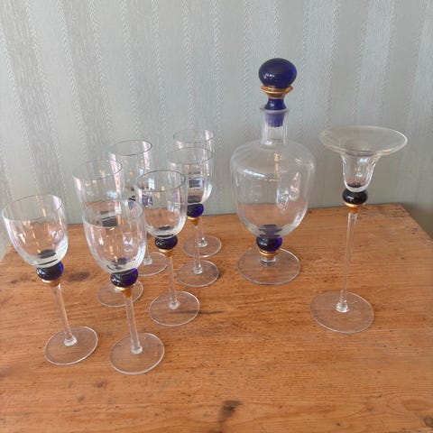 Selger nydelig karaffel med 5 - 6 glass, dessverre det ene glasset stettet gått av, kan limes. Selges grunnet flytting og mindre plass.
