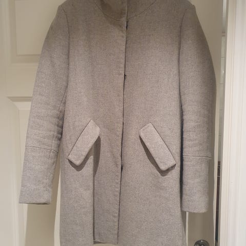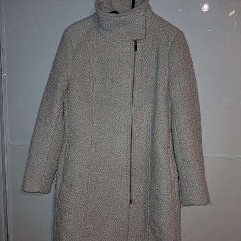 Beige kåpe Calvin Klein US size 4 (34). 60% ull, 35% polyester, 5% other fibers.Faux leather trim. Vintersalg 275 kr.