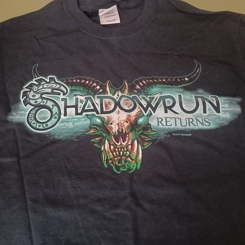 Dette er en av tre forskjellige T-skjorter som ble sendt i begrenset opplag til Kickstarter støttespillere av dataspillet Shadowrun Returns i 2013. Har flerfarget logo på frontsiden og logoen til spillutvikleren Harebraned Schemes på baksiden.