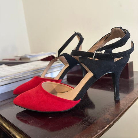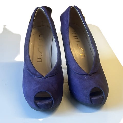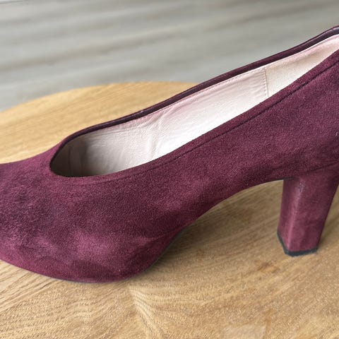 Pene stillett i fargen dyb lilla/burgunder i semsket skinn. Hælene er 11 cm høye. Kun brukt 2 ganger., og ser ubrukt ut. God såle og lest.