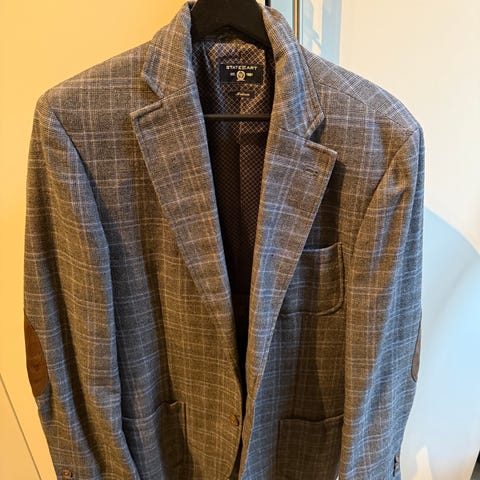 Meget pen pinstripe dress. Farge koksgrå med smale lysgrå striper. Str. 52. Må selges da den ikke passer eieren og er bare brukt et par ganger.