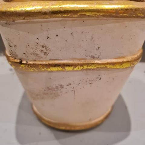 Har et bittelite skår, men det synes ikke når potta er i bruk. Kr 75,-