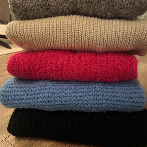 Det blå/hvite genseren har knappene bak.