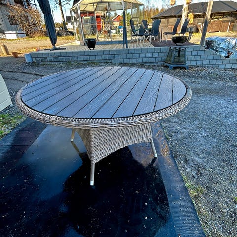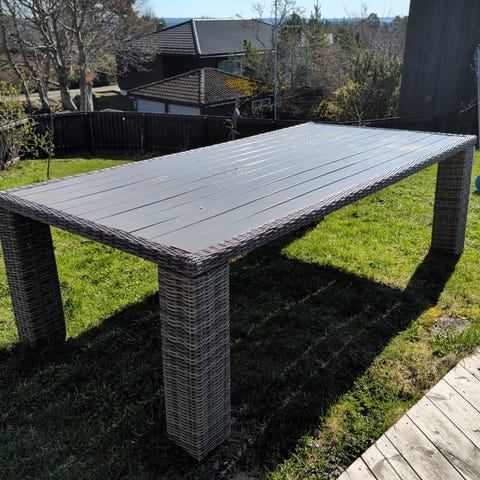 Lekkert ovalt spisebord i rotting med glassplate. Mål er B:103 L:184. God plass til mange rundt et stødig og solid bord.