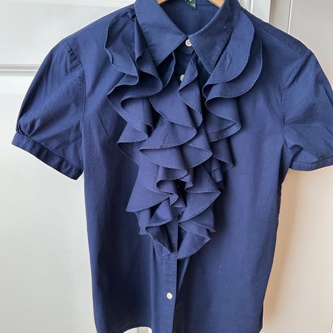 Trendy designerbluse fra Ralph Lauren i str. 12. Tilsvarer str. 38. Hvit, 100% bomull. Som ny. Kort/vid pufferme m/ mansjett. Lang knyte sløyfe, Som ny. Selges for kr 400. Evt. porto i tillegg. Se mine andre annonser for Ralph Lauren kjole (sort)