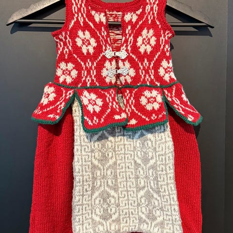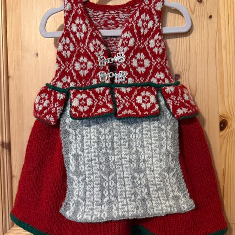 Nydelig strikket trønderbunad til jente. Selges med skjorte. Datteren min har brukt den fra 5-9 år så man får muligheten til å bruke bunaden til flere anledninger. Ikke flekker på den.