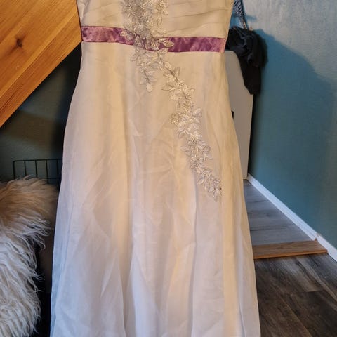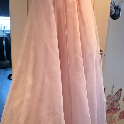 Nydelig babyrosa ballkjole, brukt en gang. Vært oppbevart i tørr kjeller. Kjolen har perlebroderi på byste og skjørt.