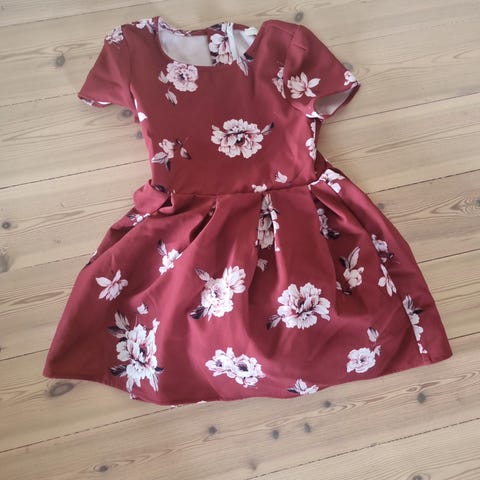 Med nydelig blomsterdetalj. Pent og lite brukt kun få ganger da jenta mi vokste fort ut av den. Perfekt til bruk i julen! Str 98/104. Kan sende mot at kjøper betaler porto.