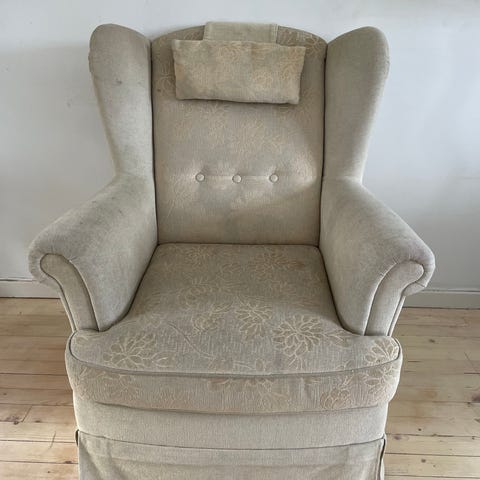 En pent brukt lenestol i rosa velour. Må hentes snarest