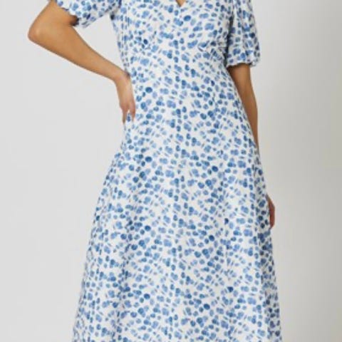 Fin omslagskjole i deilig materiale (overstoff: 100 % viskose, for: 100 % bomull). Kjøpt brukt, men ble dessverre akkurat for liten for meg. Brukt én gang av forrige eier, kun prøvd på av meg. Har ikke funnet noen bruksmerker.