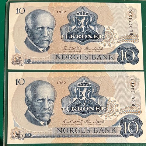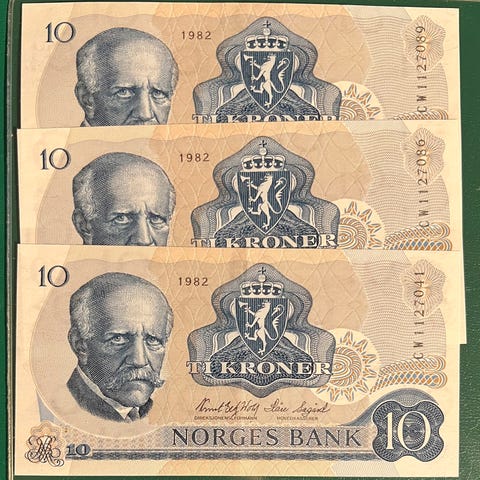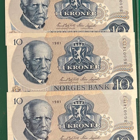 NORGE 10 kroner 1984 CM. TRE STK. I REKKEFØLGE. UNC