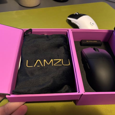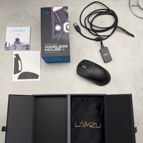Musen har ikke blitt brukt eller slått på. Musen kommer med både 8K dongle og standard 1K dongle og adapter.
