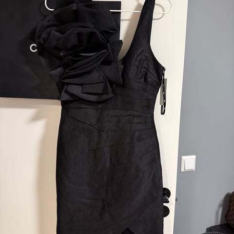 Sløyfe i ryggen, justerbar passform. Kjolen har lommer. Str.8