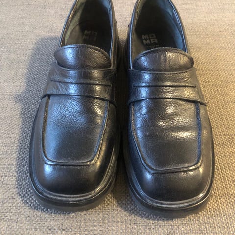 En helt unik randsydd sko fra italienske Moma i kraftig skinn med flettet mønster på tuppen. Skinntrukket hæl og lærsåle. En modell som piffer opp ethvert antrekk. Kun brukt et par ganger, selges fordi har flere Moma-sko. Svært god kvalitet - sko man har år etter år.