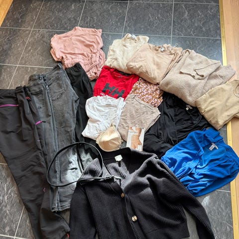 Stor klespakke med diverse klær i diverse farger selges samlet. Klærne er alt fra shortser til regnfrakk.( se bilder) noe kan trenge en vask men ellers er klærne mye av klærne lite brukt.