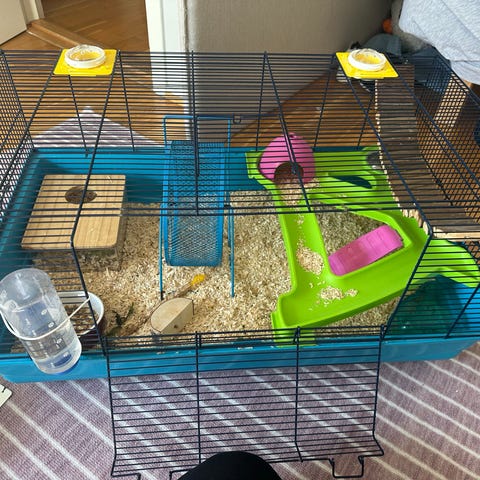 Burene er romslige og passer bra til syrisk hamster. Begge bur er godt utstyrt med det som trenges til en liten gnager.