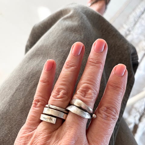 Vakker og spesiell ring med innfattede røde steiner. De varierer noe i nyanse som gir en fin helhet og de er fattet inn slik at lyset slipper igjennom.
